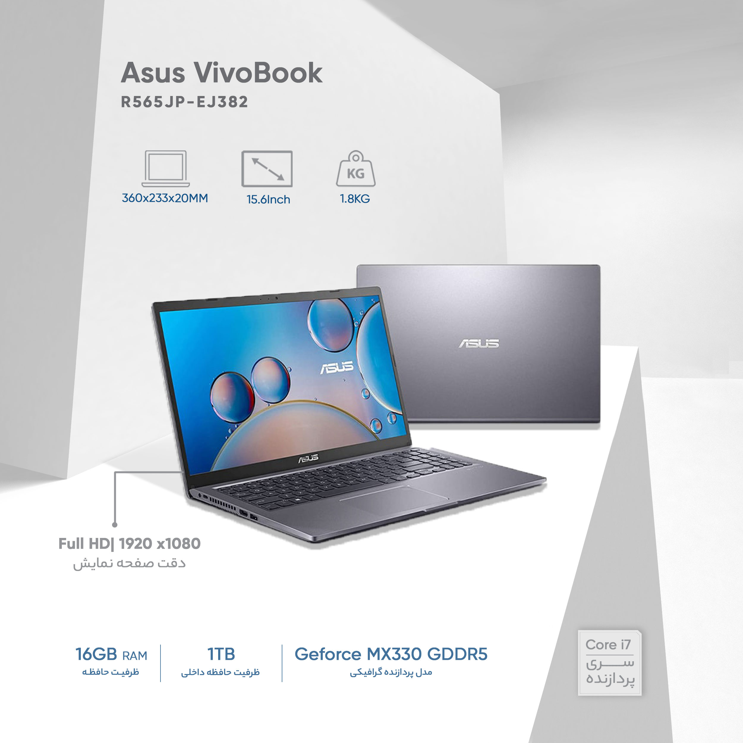 لپ تاپ ایسوس مدل R565JP-EJ382 از محصولات سری «VivoBook» شرکت «ایسوس» است .این محصول به موجب طراحی ظریف، زیبا و وزن کم آن، در نگاه اول همچون یک بالا رده به نظر میرسد. صفحه نمایش 15.6 اینچی این محصول، قابلیت نمایش تصاویر با کیفیت Full HD و رزولوشن (1080×1920)پیکسل را دارد و با وجود روکش مات آن، از بازتاب نور و نهایتاً در طولانی مدت از خستگی چشم جلوگیری خواهد کرد.در این محصول از یک باتری دو سلولی با توان خروجی 37 واتساعت استفاده شده که قابلیت نگه داری شارژ تا 2 ساعت را دارد.ابعاد این محصول معادل36 در 23.3 در 2 سانتیمتر و وزنی معادل 1.8 کیلوگرم دارد. در طراحی این محصول از 2 پورت USB 2.0 ، 1 پورت USB 3.0 ، پورتهای HDMI، USB Type-C ،پردازنده نسل دهمی Intel Core i7 مدل1065G7 با فرکانس پایه 1.3 گیگاهرتزی ، 16 گیگابایت رم DDR4 و یک ترابایت هارد دیسک برای ذخیره سازی اطلاعات استفاده شده است. برای اتصال بی سیم به اینترنت نیز از WIFI 5 پشتیبانی میکند. این محصول انتخاب مناسبی برای کاربری روزمره، دانشجویی و مالتی مدیا است.